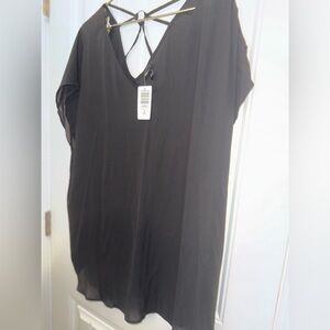 This stylish black tunic from Torrid showcases a sophisticated backless design and short sleeves, perfect for a modern and versatile look. The solid black color enhances its elegance, making it suitable for both casual and formal settings. Its clean silhouette ensures a flattering fit for any occasion. Beautiful summertime to have your collection for this summer business casual or out to dinner look.
