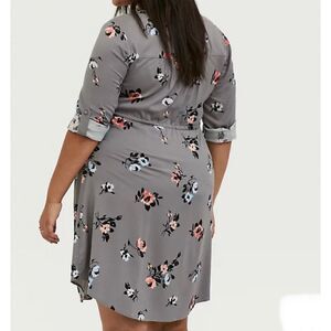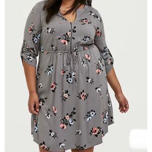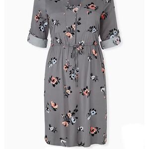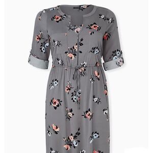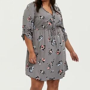 TORRID GREY FLORAL CHALLIS ZIP FRONT DRAWSTRING SHIRT DRESS