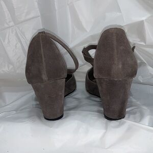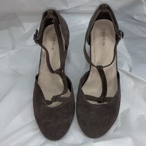 Torrid Gray Leather Suede Mary Jane Mini Wedge w Buckle Strap Size 13W. Wear on soles and dirty soles. Wear and tear on insoles. See photos.