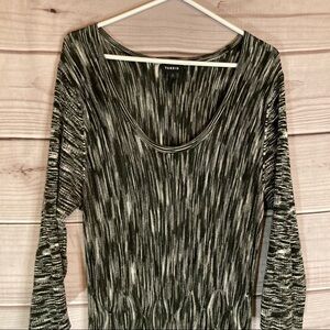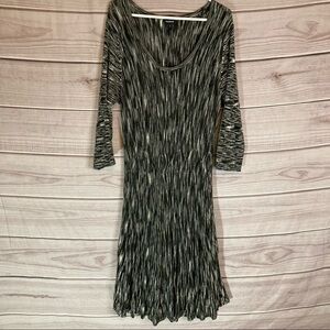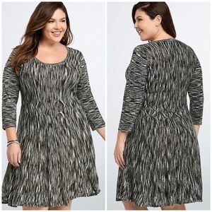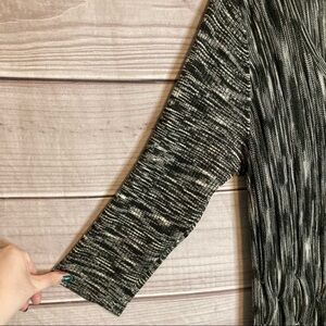 In excellent used condition no rips, tears or stains. This sweater dress has us feeling all dressed up with everywhere to go! While the stretchy/cozy, black and white marled knit style keeps you cozy, the cable knit waist covers any tummy misgivings, and the flared skirt has us feeling the flow. Stretchy fabric.