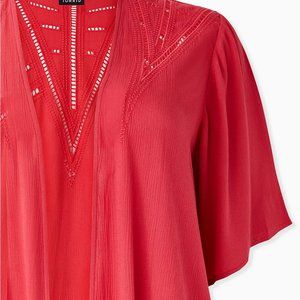 Brand new, Torrid Red kimono crochet insets capture boho vibes in this airy crinkled gauze kimono.