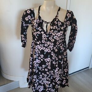 Charm abounds in this delightful dress, ready to infuse your wardrobe with effortless elegance. A captivating floral print graces the flowing silhouette, set against a deep black backdrop for a look that's both striking and versatile. The design features alluring cold shoulder cutouts paired with long sleeves, creating a balanced and modern aesthetic. Details include a flattering empire waist and a tie neckline, which add a touch of bohemian flair.