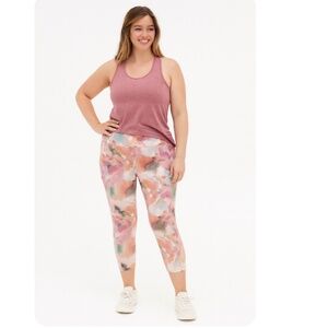 These soft and stretchy cropped leggings by Torrid feature a beautiful multicolor watercolor tie-dye print with shades of pink, green, peach, and touches of black on a white background. Designed without pockets for a smooth fit, they’re perfect for lounging, workouts, or pairing with your favorite oversized tee.