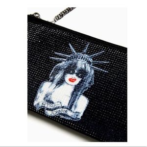 Accentuate your look with this shimmering convertible bag that can be made into a wristlet or crossbody and features a unique Betsey Johnson graphic on the front.