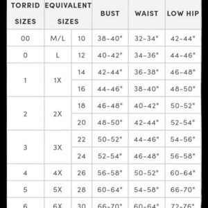 TORRID SIZE 00=M/L Bust: 40" & Length: 36" All measurements are approximate. I don't accept returns for approximate measurements Thank you. 😊
