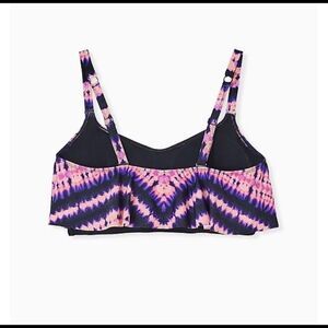 New with tags TORRID PINK & PURPLE TIE-DYE MEDALLION WIRELESS FLOUNCE BIKINI TOP. Size 3X, nylon spandex, Wireless cups, Flounce overlay, Adjustable multiway straps, Mesh lining, UPF 30+ sun protection. See pictures for details.