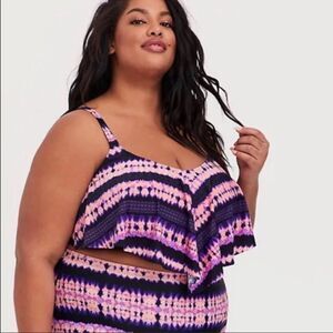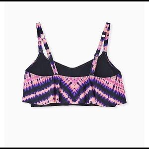 TORRID PINK & PURPLE TIE-DYE MEDALLION WIRELESS FLOUNCE BIKINI TOP. Size 1X, and 3X, nylon spandex, Wireless cups, Flounce overlay, Adjustable multiway straps, Mesh lining, UPF 30+ sun protection. See pictures for details.