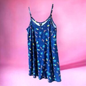 A FUN TROPICAL PRINT WITH PINEAPPLES, PALM TREES, AND COCONUT DRINKS ON A TRAPEZE DRESS IS SURE TO BRIGHTEN UP YOUR VACATION. IT'S A PERFECT SUMMER VACATION DRESS.