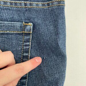 ◇ Plus size 18R / 18 regular length. Approx darker medium wash or dark wash. Intentionally faded whiskered whiskering distressed. "Mid rise waist" (according to brand). Five pocket and zipper zip fly. Has stretch. Skinny jeans skinny jean