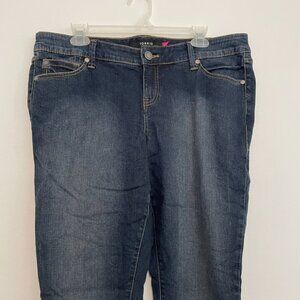 ◇ plus size 14. Dark wash intentionally faded whiskered distressed. "Mid rise waist" (according to brand). Five pocket and zip fly. Has stretch. Cropped crop ankle length. Skinny jeans skinny jean. Can be worn cuffed or uncuffed