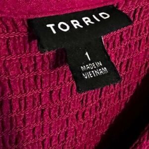 Torrid Size 1=1X Bust: 38" & Length: 26". All measurements are Aporoximate. The color of this cute tunic is Beaujolais Burgundy. Due to lighting Items may appear darker or lighter than they actually are.The first photo of the woman is the color. Ty ๐