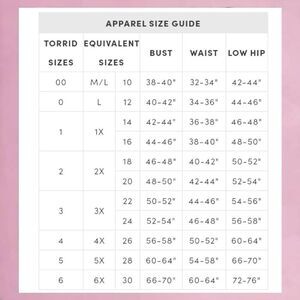 💥TORRID Size 1=1X Bust: 50" Is oversized in the bust area. Could fit a 2X. Length: 29.5". All measurements are Approximate and taken laying flat.