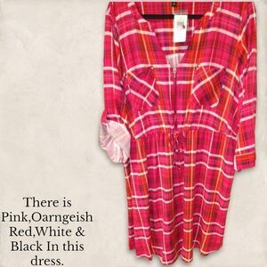 Women's Plus Size Bright Plaid with Pink Front Zip Shirt Dress.