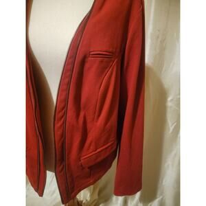 Red Torrid blazer size 2. Faux double zipper detail up the front. Sleeves are 25" long. Shoulder to hem is 24" long in front. Shoulder to hem in back is 21". 22" pit to pit. The fabric or this blazer has stretch to it.