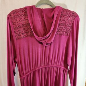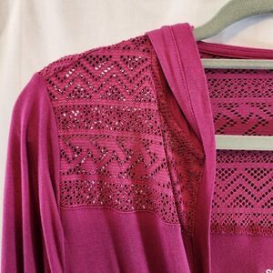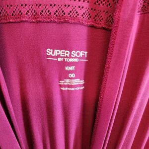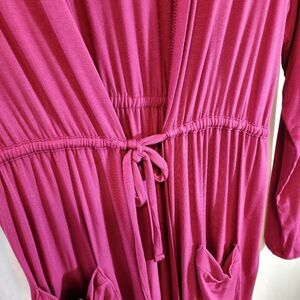 NAME: TORRID SUPER SOFT CARDIGAN SIZE 00 DEEP PINK FUSCHIA MAGENTA VERY SOFT GREAT CONDITION TIE FRONT AT THE WAIST RELAXED FIT LACE YOKE LONG SLEEVES FUNCTIONAL SQUARE SIDE POCKETS STRETCH TUNIC LENGTH VERSATILE
