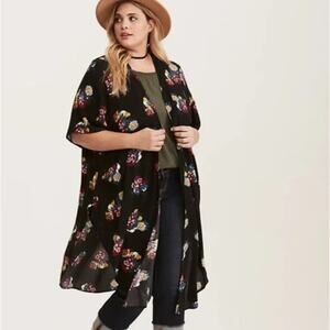 TORRID | Size 1X/2X | 100% Rayon Black Floral Shirttail Kimono Cardigan Duster