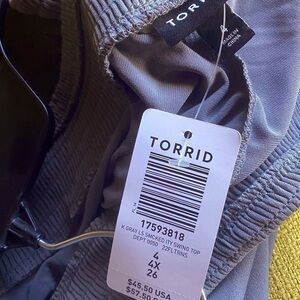 Studio Knit fabric: Maximum Stretch, wrinkle resistant fabric,  with an easy refined look 95% polyester 5% spandex Color is gray. See Torrid size chart for sizing& fit