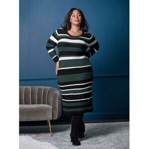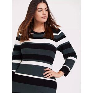 This classic Torrid striped sweater dress is perfect for any occasion. The stylish black, white, and green stripes create a timeless look, while the soft, stretchy knit fabric ensures a comfortable and flattering fit. It’s a versatile piece that can be dressed up or down, making it a great addition to your wardrobe. Perfect for pairing with boots for a casual day out or with heels for a night on the town!