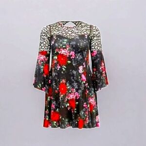 This women's floral super soft dress features lace insects, Bell sleeves, and an A- line silhouette.