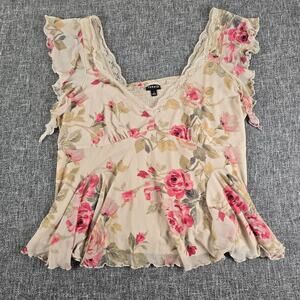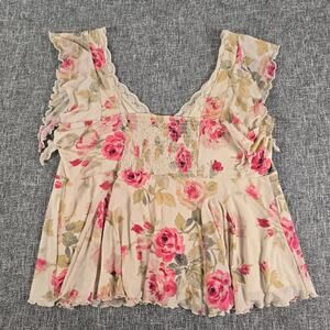 Torrid women’s blouse featuring a beige background with pink rose floral print. Designed with flutter sleeves, lace-trimmed V-neckline, and a flattering empire waist that flows into a peplum-style hem. Lightweight and feminine, perfect for casual outings or dressed-up looks.