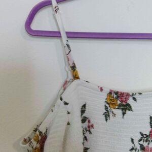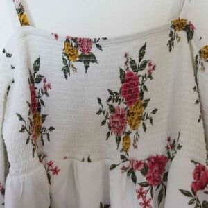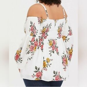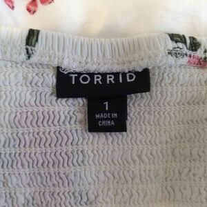 Gently used Torrid floral off-shoulder top. Perfect for any occasion, its white base with pink and yellow floral patterns adds a touch of charm to your wardrobe.