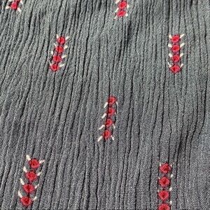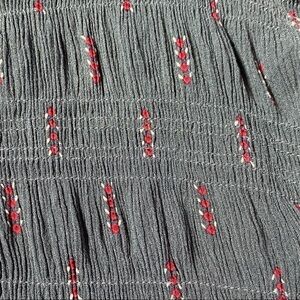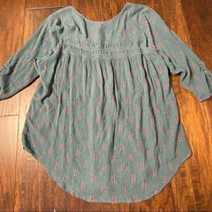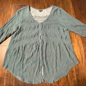 Pretty dark teal with red floral type print. Deep v-neck with front buttons. Gathered detail on the arms.