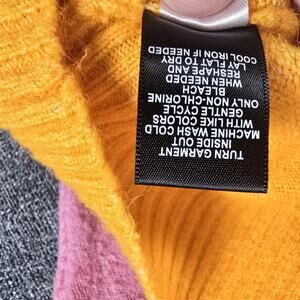 Fun and cozy colorblock sweater featuring a bold golden orange body with contrasting pink sleeves. Soft knit fabric with ribbed neckline, cuffs, and hem. Perfect for adding a pop of color to your fall and winter wardrobe.
