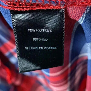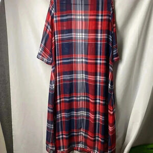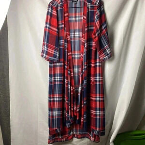 TORRID WO SIZE 0/00 (10/12) LONG NAVY RED PLAID. SHEER OPEN FRONT DUSTER