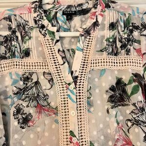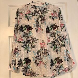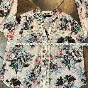 TORRID Women’s Chiffon Clip Dot w/ Lace Inset Top Sheer Fabric Size 0 (Large). V-neck button up blouse. Measurements in photos. In good, pre-loved condition. Comes from a smoke free home.