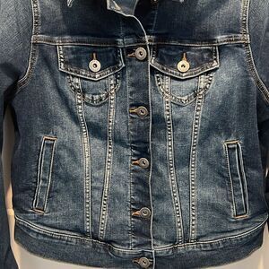 TORRID Women’s Denim Jean Jacket Coat Trucker Style Stretch, Excellent gently used condition, only worn a couple of time.Super cute new denim jean jacket from Torrid. Slightly distressed trucker style denim jacket. Front pockets. Button up front. Back has buttons at waist to make it more fitted if you choose. Long sleeves button at wrist.
