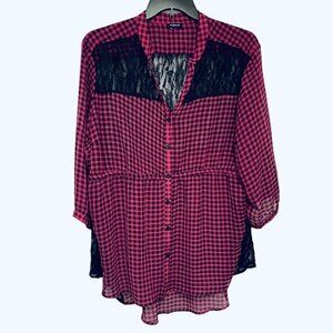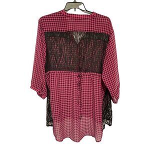 TORRID ~ Women's loose-fitting, button-up tunic top. Bust size 52" (Determined size 22 by measurements). Pink and black plaid with black lace inserts. Button up front with elastic waist and tie. High-low hem. 3/4 button cuff sleeves. Lightweight.