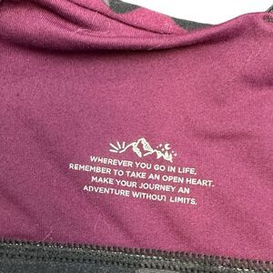 Torrid “Happy Camper” low-impact zip-front sports bra in a bold camo print with purple, pink, gray, and black tones. Features a flattering crisscross lattice back, double interior hook closure behind the zipper, and a motivational quote printed inside: “Wherever you go in life, remember to take an open heart. Make your journey an adventure without limits.”