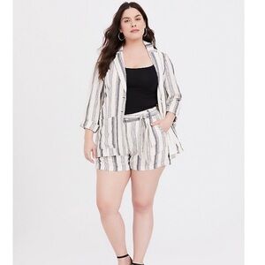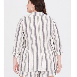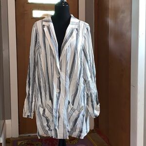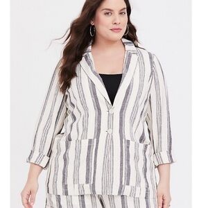Brand new with tags from torrid! This blazer has long sleeves with roll cuffs, a fold over collar and two button closure down the front. Linen material with a knit lining for comfort and still lightweight! Deep front pockets. White background with black stripes. Torrid size 4, 24/26.