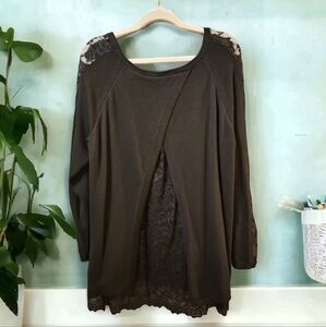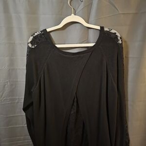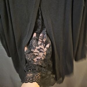 black knit and lace sweater. Open back with lace, lace down arms and scallop lace bottom of sweater front and back.