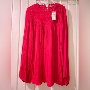 NWT and no defects. Size 3X(22-24) TORRID magenta crinkle blouse with lace area. Lace area is sheer as seen in picture. Very cute. Armpit to armpit 26 1/2” and centerback length is 30. Tote 12.