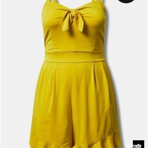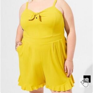 Brand new with tags from torrid! This bright yellow Challis Tie-Front Romper is a torrid size 3, plus size 22/24. Shorts have a 5” inseam. Medium Stretch, rayon and spandex blend. Vneck, pockets, sleeveless with adjustable straps.