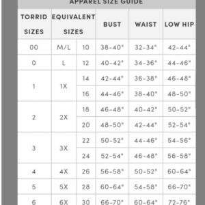 Torrid Size 2=2X Bust: 42"-48" & Hi length: 31" & Lo Length: 34" All measurements are approximate and I don't accept returns for approximate measurements Thank you.