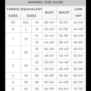 TORRID SIZE 3=3X Bust: 48"-50" & Length: 38". All measurements are Approximate and taken laying flat. I do not accept returns for approximate measurements. Please take a look at the Torrids size chart to get your correct size thank you.