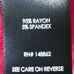 : Material is 95% Rayon & 5% Spandex. : Machine Wash Cold Line dry.