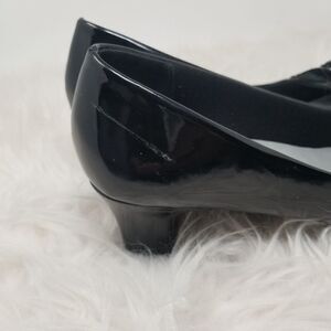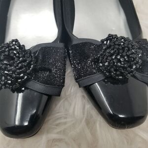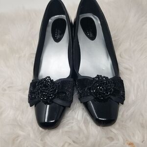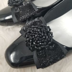 Black patent leather type shoe with beaded bow accent. Size 8.5M. Very gently used condition. Heel is approximately 2".