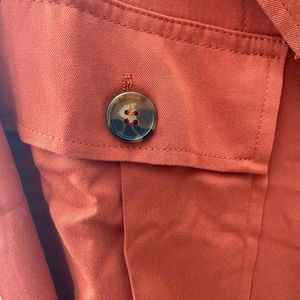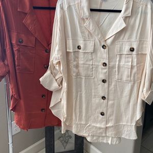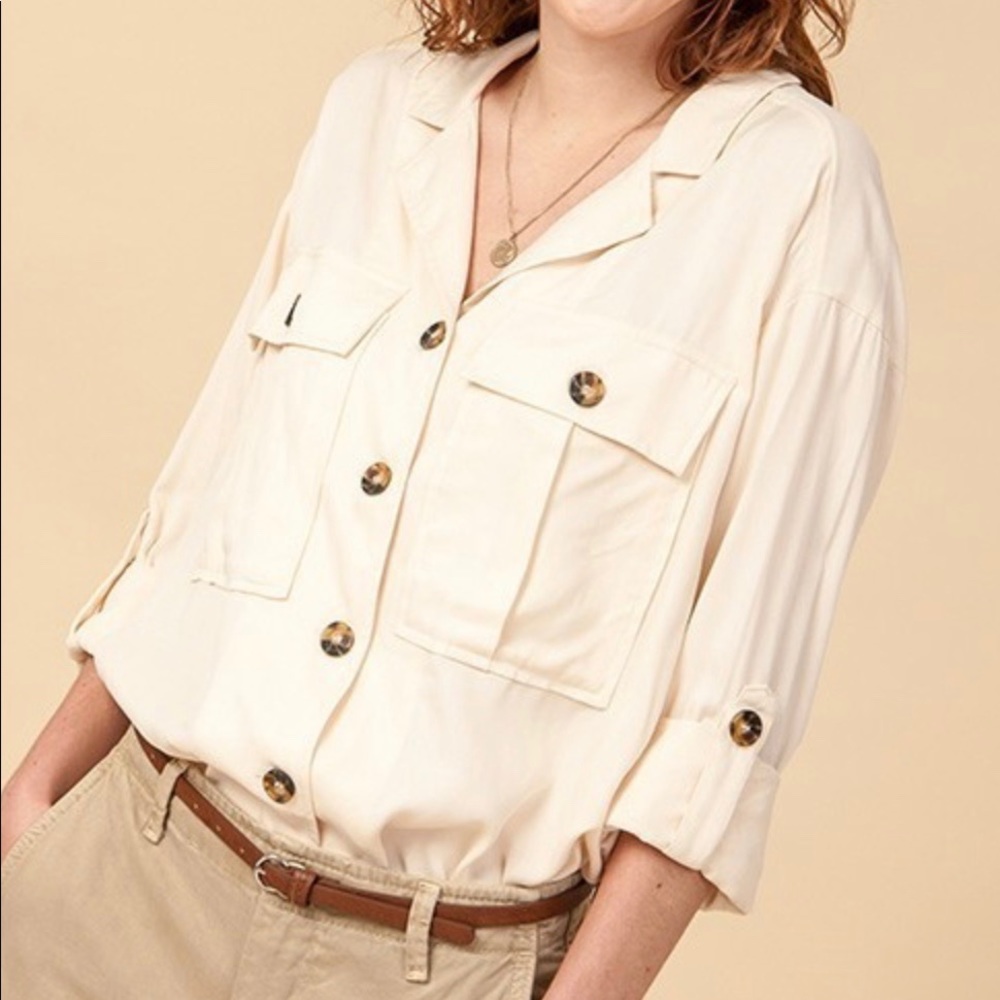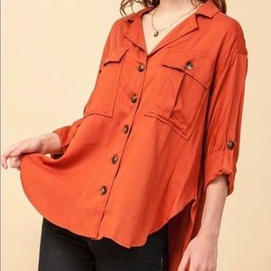 Very soft long sleeve cargo top with tortoise button and side slit details! Sleeves can be rolled up or left down for those chillier days. A tad longer in the back makes it a staple to wear with leggings this fall. A great transition piece available in rust and beige!