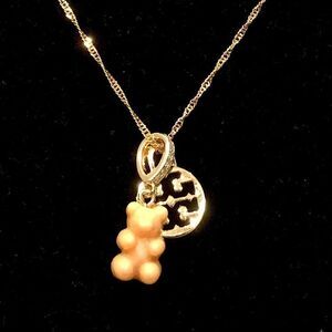 The combination of Tory Burch Charm 18k gold plated logo and 18k gold plated nostalgic Gummi bear charm makes this necklace not just a piece of jewelry, but also a conversation starter that brings back sweet memories of carefree days filled with laughter and fun.