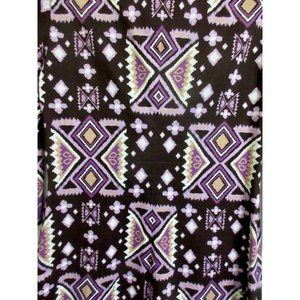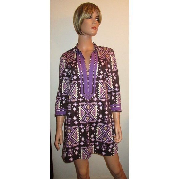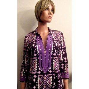Lovely Tory Burch boho caftan dress in an abstract geometric print as shown. Colors are primarily purple, eggplant, white and beige. Fabric is cool cotton with 4% spandex for a bit of stretch. Slipover style with a deep v-neck and 3/4 sleeves. Size 4. Approximate measurements: bust (at armpit) 38”, length (from base of collar) 33 1/2", sleeve 18 1/2", shoulder to shoulder 16 1/2". Superb condition!