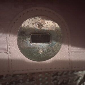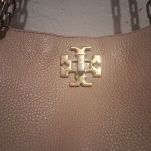This authentic Tory Burch shoulder bag was used for a while. The outer pebble leather is in good condition (no stains or tears on the soft beige leather)