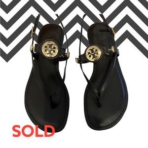 TORY BURCH ALI Anteka NEW BOX THONG FLAT SHOES SUMER BLACK GOLD LOGO LEATHER 8.5
