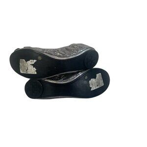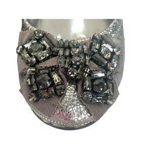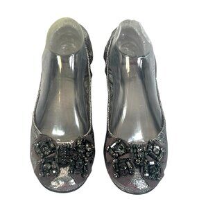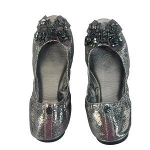The TORY BURCH AZALEA Black Crystal Bow Scrunch Flat Ballet Slats in pewter are stylish and comfortable flats perfect for casual occasions during the warmer seasons. Featuring a round toe, slip-on closure, and foam cushion insole, these ballet flats with a crystal bow accent are made of leather with a rubber outsole. The silver color and designer theme make them a fashionable choice for any woman looking for a unique and elegant shoe option. in really nice condition the wear is minimal