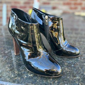Tory Burch black patent leather ankle boots in size 8.5. Heel is 4.5". Zip on the inner side.