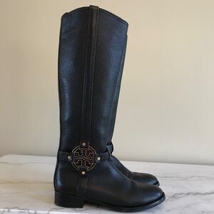 Pre-loved ~ TORY BURCH BLACK PEBBLED LEATHER TALL RIDDING BOOTS WITH GOLD LOGO
