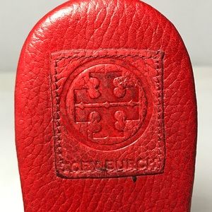 Authentic. Red leather with gold hardware. Flared thong strap features small double-T logo medallion. Adjustable buckle fastens slingback. Finished with padded insole and logo-embossed rubber sole. .75" golden block heel. Very good pre-owned condition. No major flaws to leather. Rubber soles display normal wear. Footbed displays some minor wear from normal use. Please be familiar with sizing of Tory Burch footwear ❌❌NO TRADES. NO PP❌❌