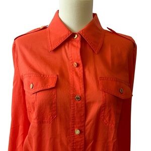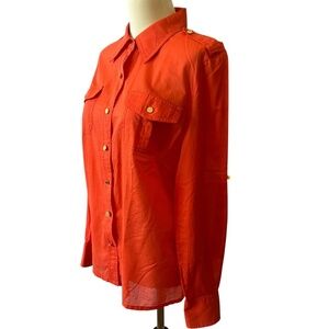 Womens size 6, bright tangerine orange, button front, long sleeves, roll tab sleeves, goldtone logo buttons, button flap closure chest pockets.